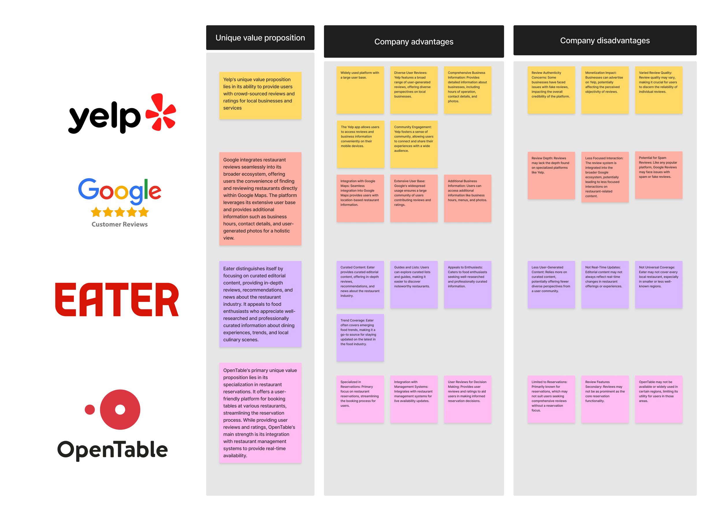 I wanted to understand the strengths and weaknesses of the current market, so I conducted a competitive analysis on four popular food review platforms. My goal was to gain insights into the user experience design and features that resonate well with their users. These insights would also provide me with the opportunity to differentiate this app with innovative solutions that these platforms lack.