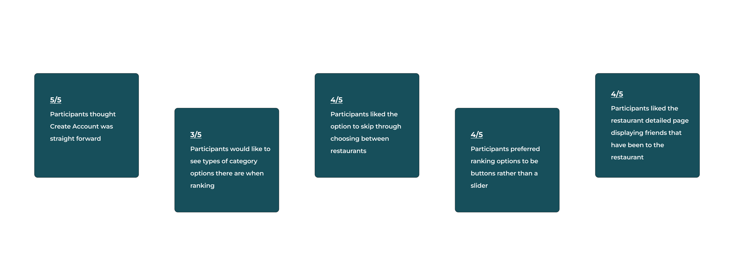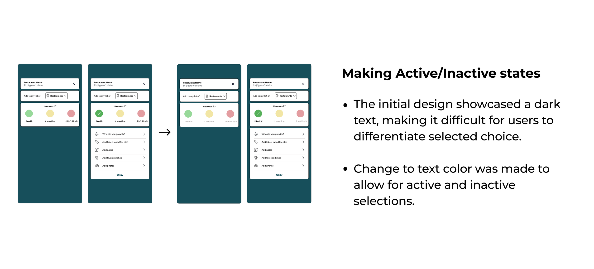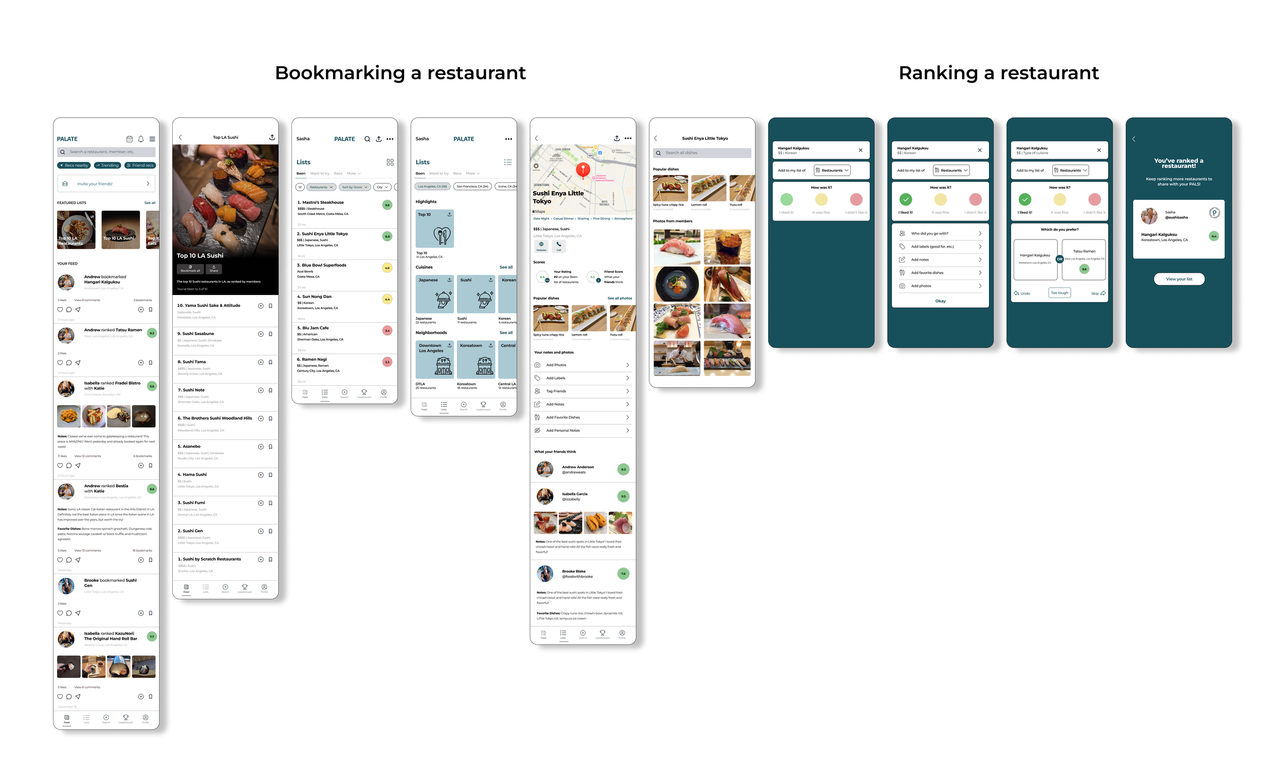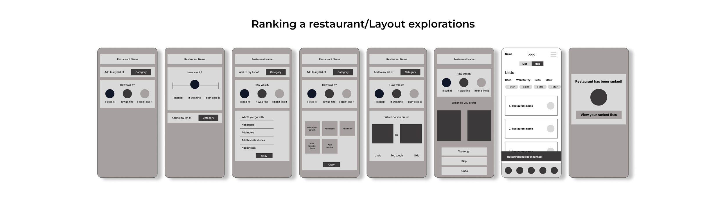 3. Include more key screens in ranking flow. Including more key screens in the ranking flow highlights how users can add their own details and notes when ranking a restaurant. Although I have the add notes, tags, favorite dishes, and photos feature shown during the ranking process, it would have been nice to provide a visual of how users are personalizing their ranking through each category.