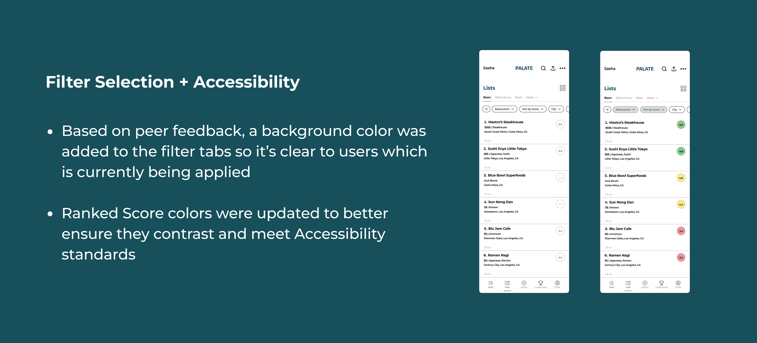 2. Showcase social interactions. Despite having the key functionality of seeing your friends' ranking of a restaurant, I feel that I fell short in showcasing how users would be able to share and recommend lists to one another. Highlighting these social interactions within the app would help foster a collaborative community experience.