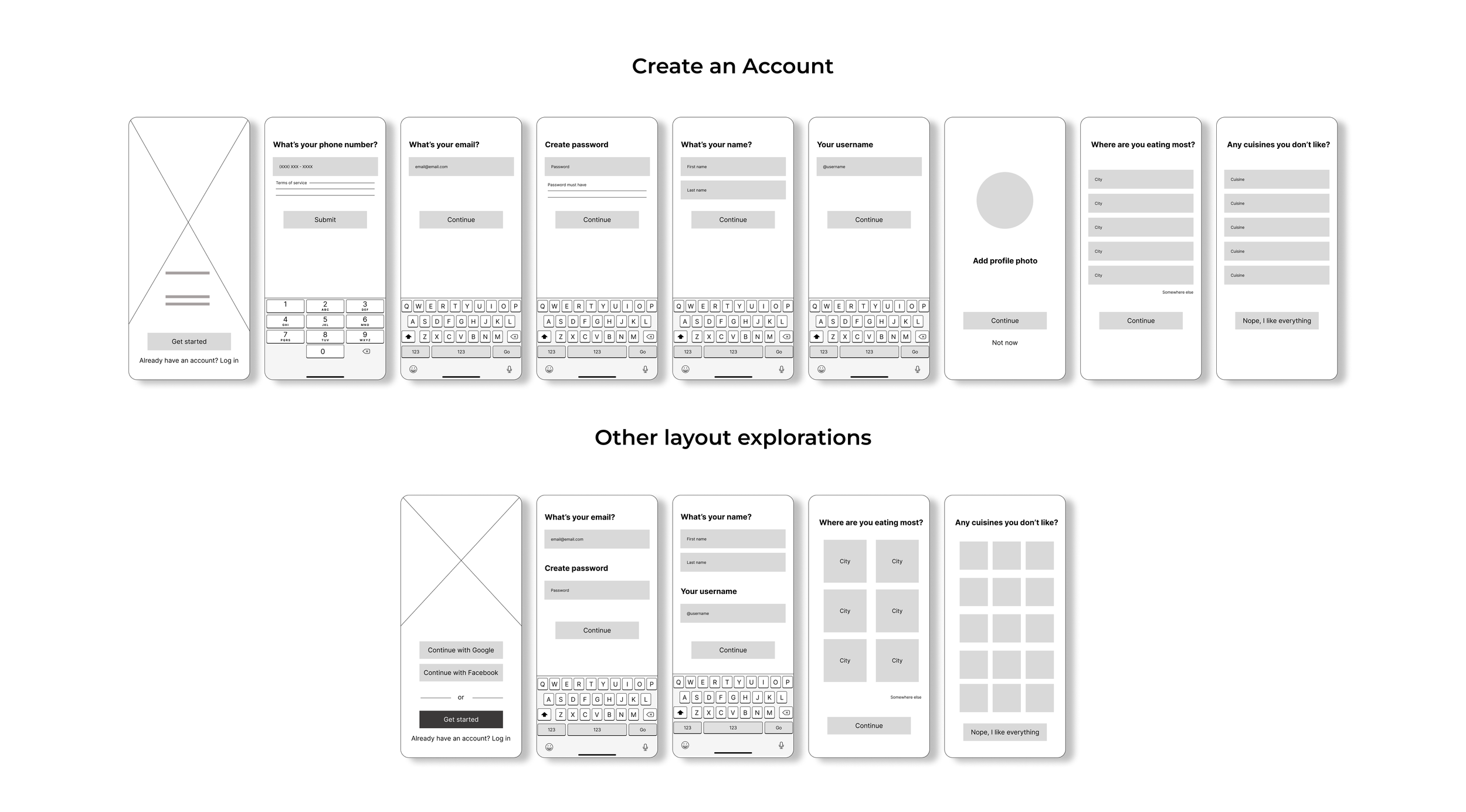 Utilizing the sitemap and user flows, I was able to create structured low-fidelity wireframes. These wireframes served as the initial representation of the app’s layout and functionality, incorporating key elements such as account creation, feed exploration, bookmarking a restaurant, and ranking a restaurant.