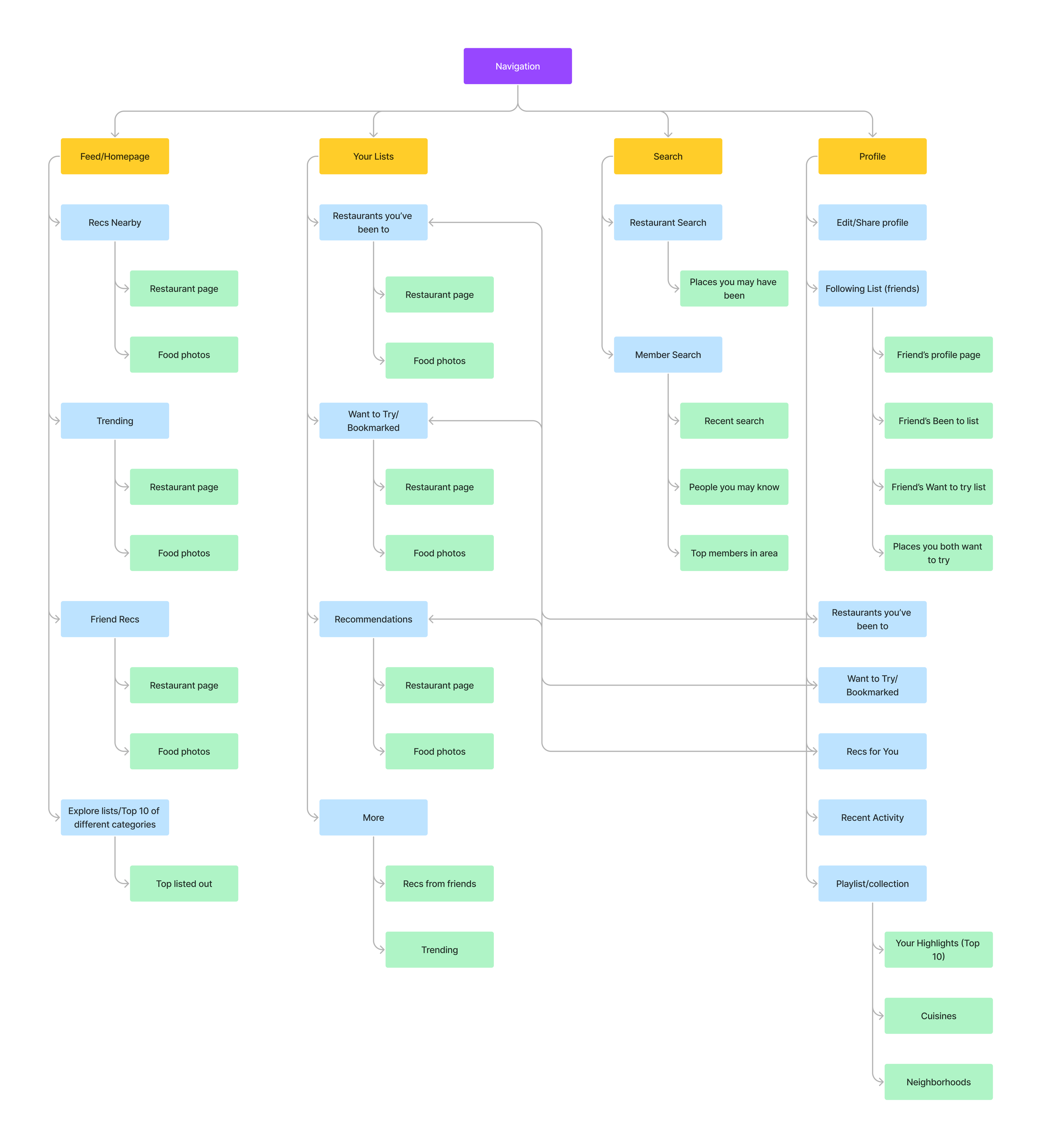 To provide a visual representation of the app’s structure and organization, I created a sitemap. Since this is a social-driven restaurant review/ranking app, I modeled the structure to be similar to known social media platforms like Instagram. The main navigations include a Feed/Homepage where users are able to explore top restaurants and recent rankings posted by their friends, a lists page for easy restaurant tracking of where they’ve been to and where they saved for their want to try, a search to find restaurants and other members on the platform, and a profile page for users to manage their following and lists.